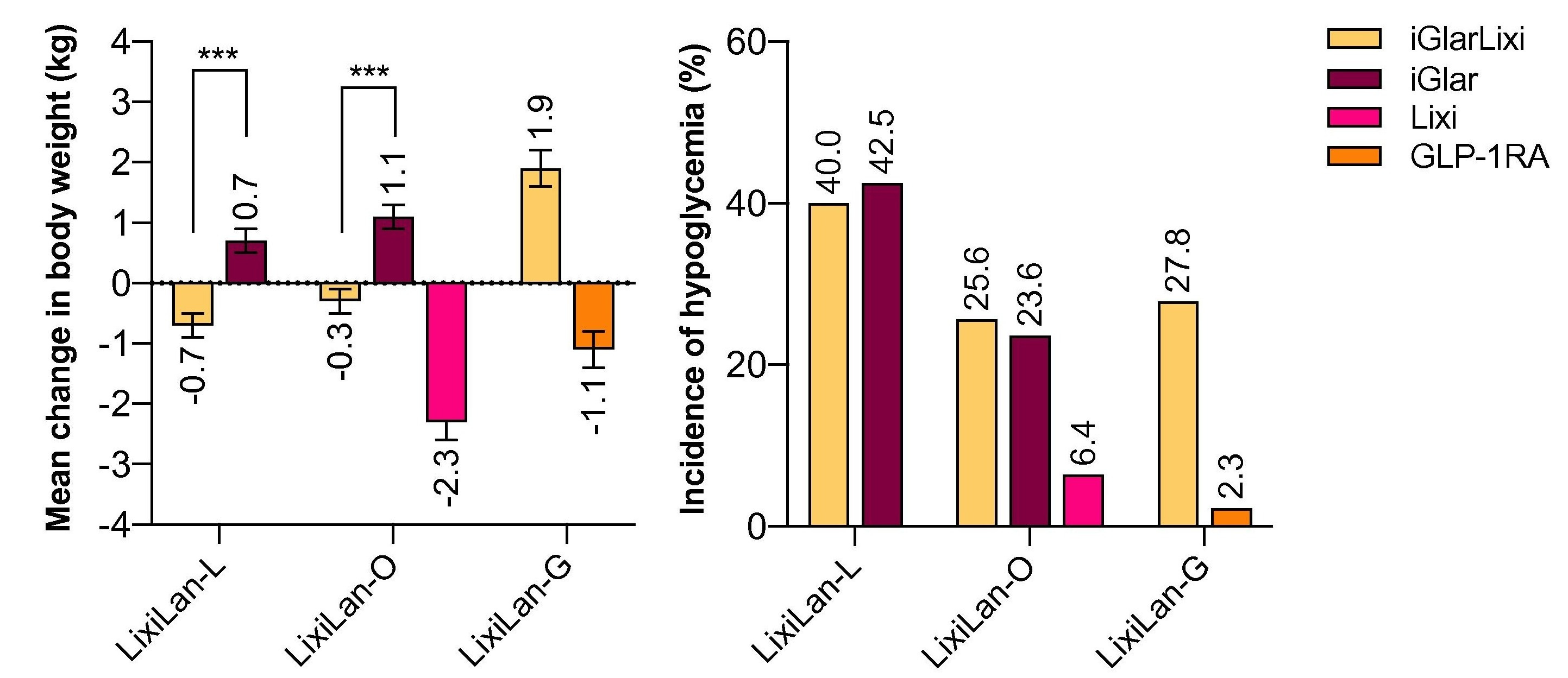 The addition of a GLP1-RA at the same time of a basal insulin offsets the potential weight gain and hypoglycemic effects of basal insulin alone. This can be seen in the figure below which shows the average change in weight (left panel) and incidence of hypoglycemia (right panel) from 3 different iGlarLixi trials.4